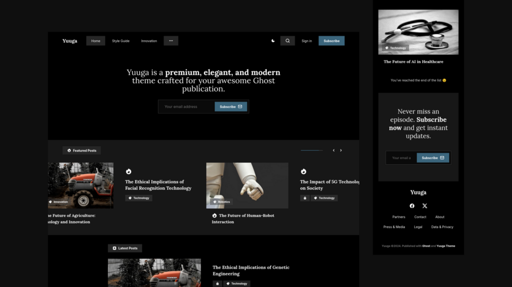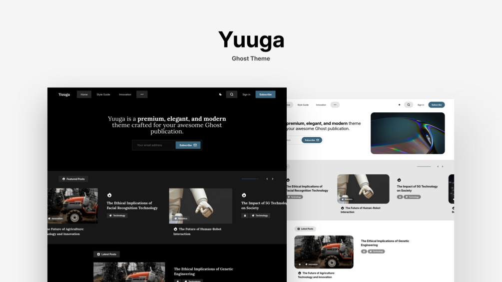 Yuuga is a premium, elegant, and modern theme crafted for your Ghost publication. Whether you prefer an elegant or a modern look, Yuuga offers the features to create a visually stunning and professional website.